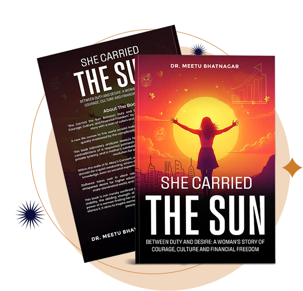 Welcome to the official website of ‘She Carried the Sun,’ a heartfelt memoir by Meetu Bhatnagar. This inspiring book shares Meetu’s personal journey as she finds her strength and voice within the boundaries of a traditional Indian household. From early struggles to finding her own path, she opens up about life, choices, and freedom. Meetu’s story speaks to anyone searching for courage, overcoming barriers, achieving financial freedom and fulfilling life. Here, you’ll learn more about the book, its message, and the author behind it—all written from the heart to reach yours.